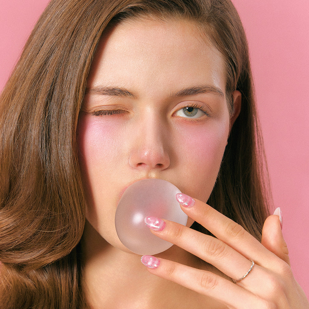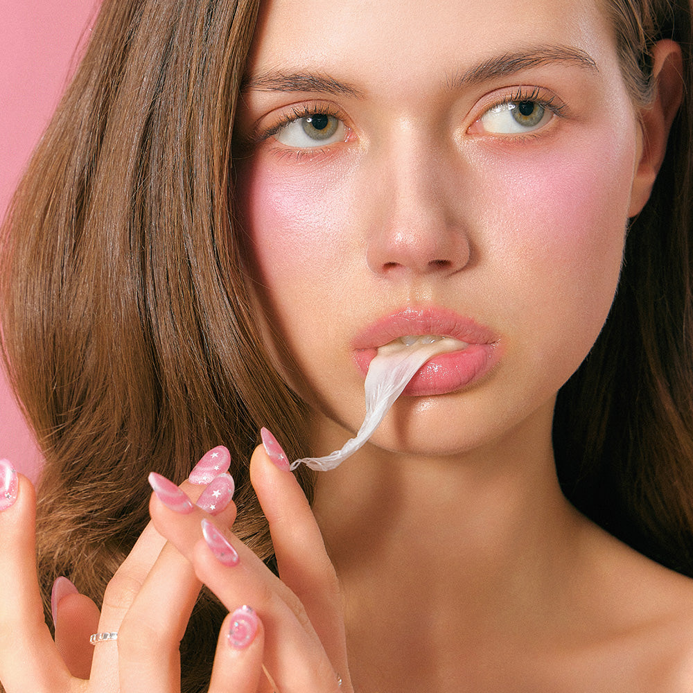 Heart accents float in glossy, syrupy red like sweet jelly jam, blending bold emotion with chic sweetness.