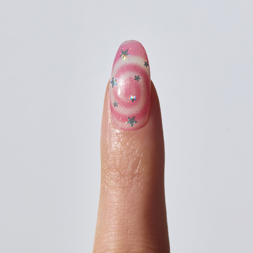 A soft pink gradient with fine glitter, aurora flakes, and delicate butterflies feels like Cupid’s magic at your fingertips.