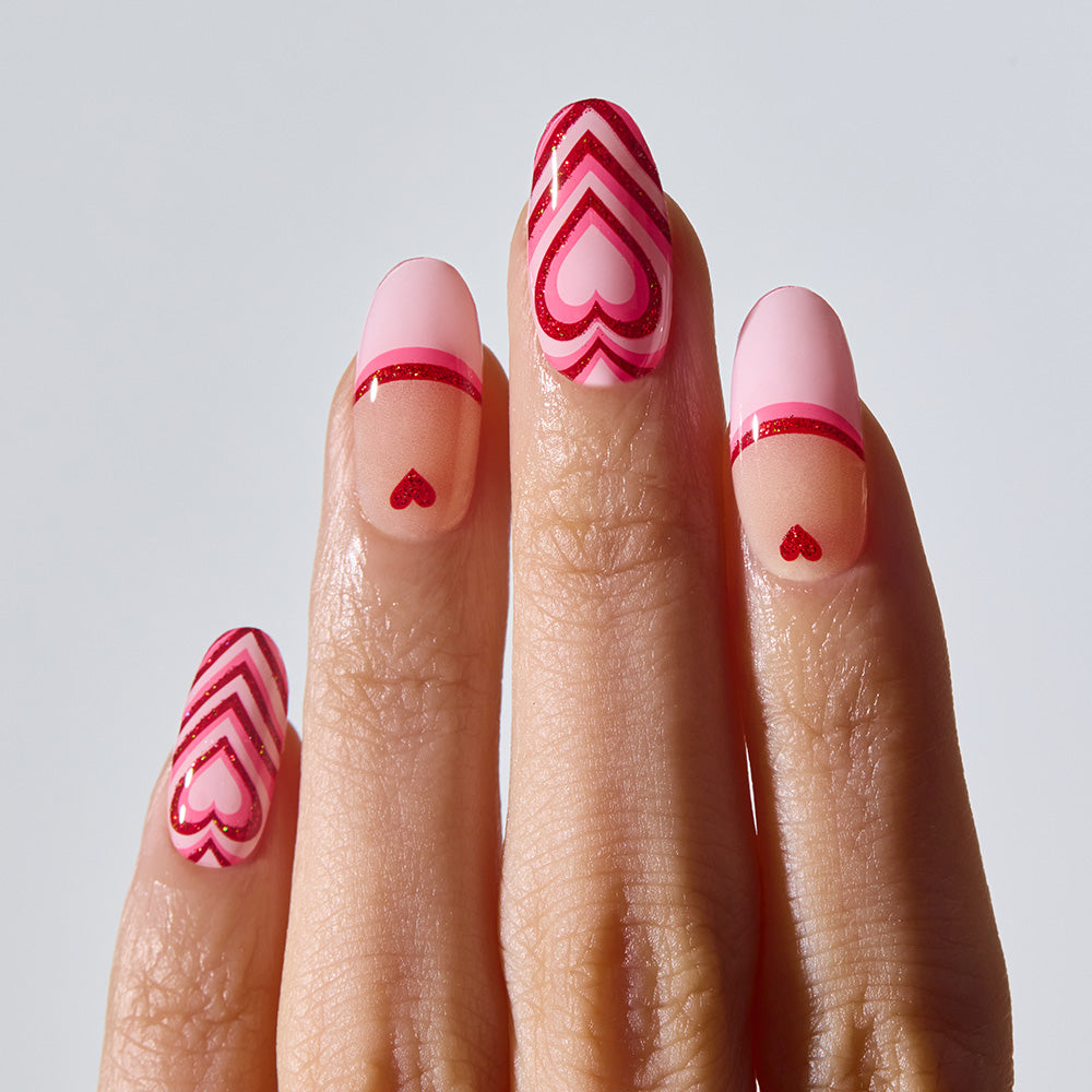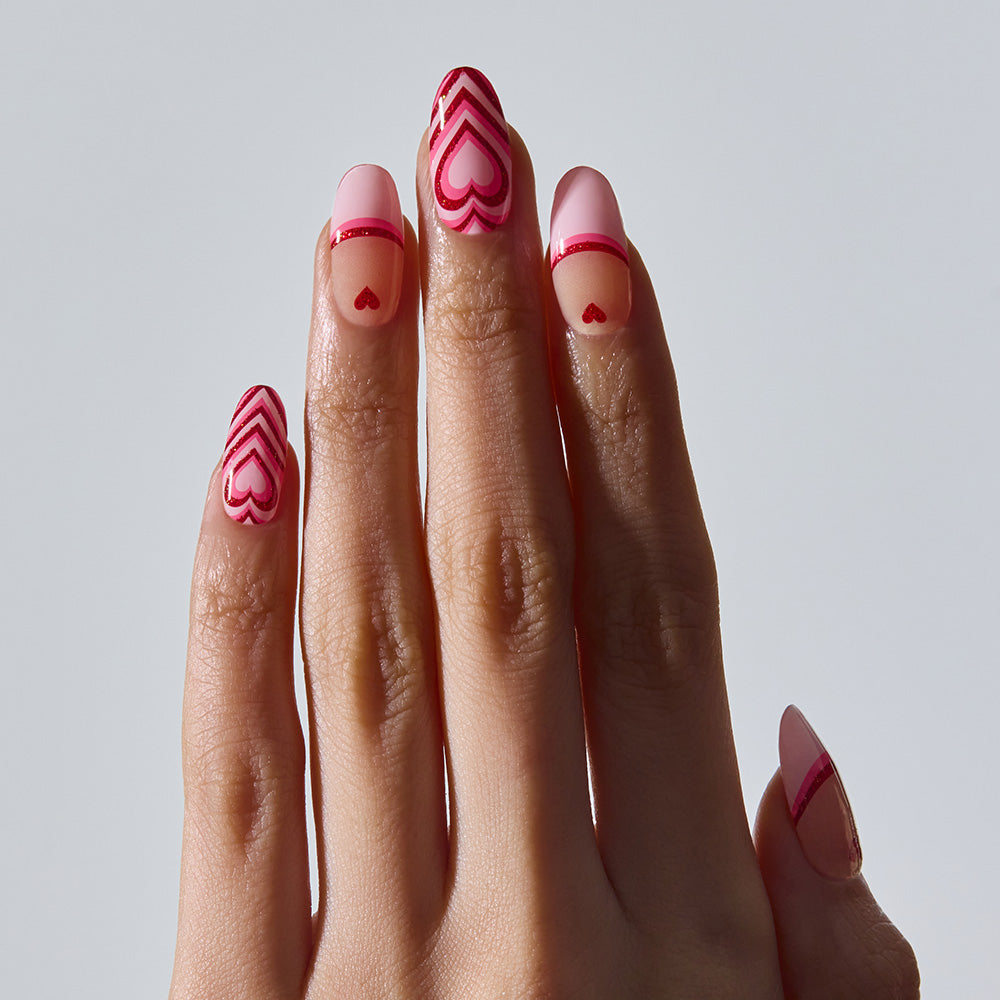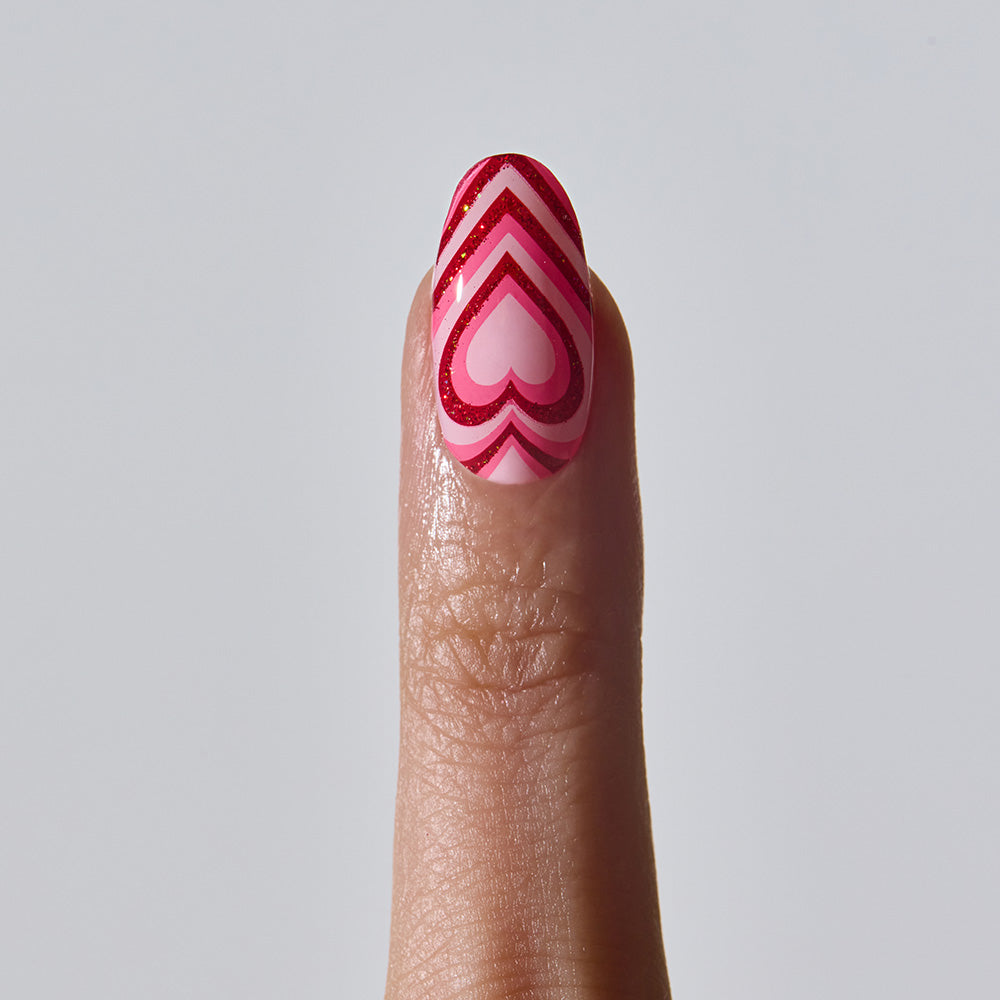 Sweet, bubblegum-inspired colors pop playfully across the nails, blending with the bold energy and kitschy charm of hot pink hearts. Red glitter sparkles between the heart patterns like a sprinkle of love potion, creating a lively and unique design. Up close, mischievous details shine through, delivering a stylish yet playful Valentine statement.