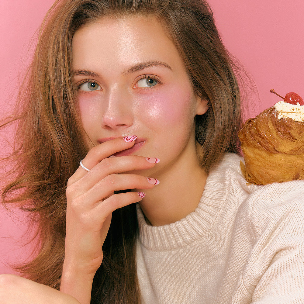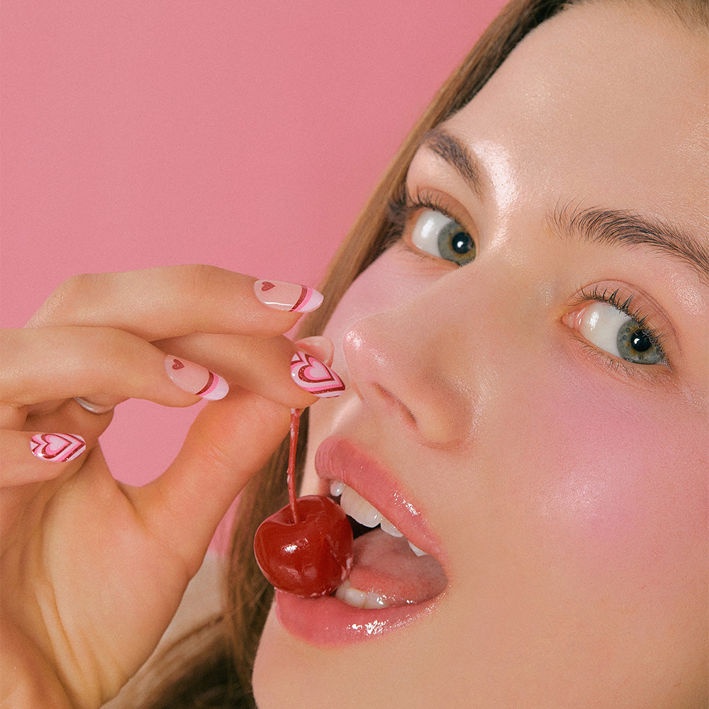 Heart accents float in glossy, syrupy red like sweet jelly jam, blending bold emotion with chic sweetness.