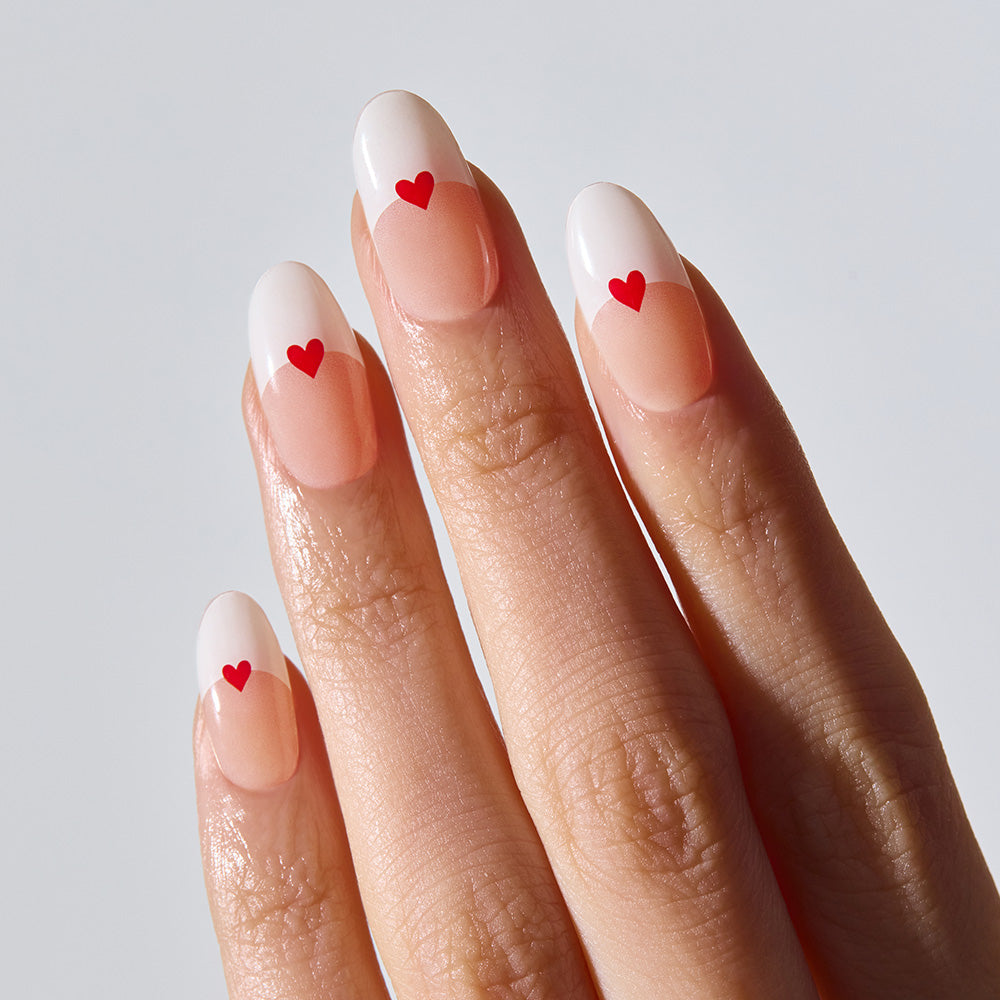 A nude-pink base with clean white French tips and tiny red hearts captures a pure, fluttering Valentine romance.