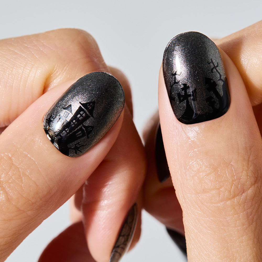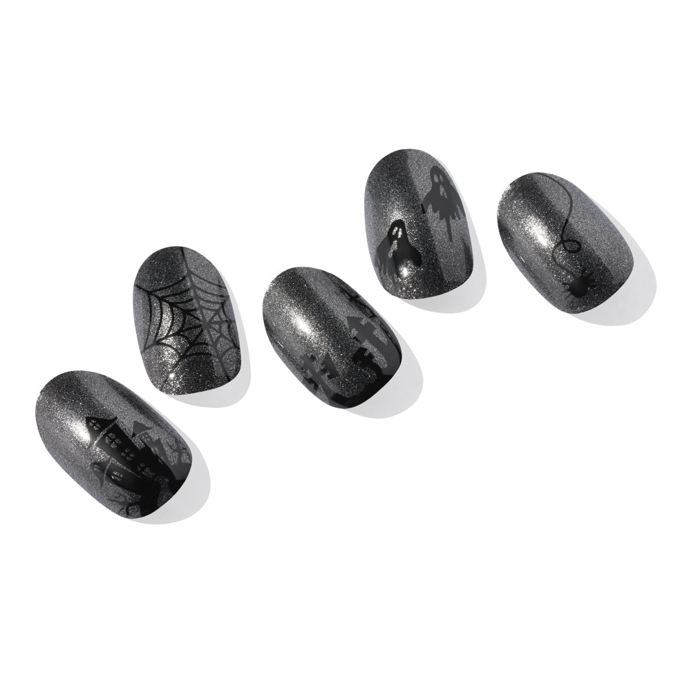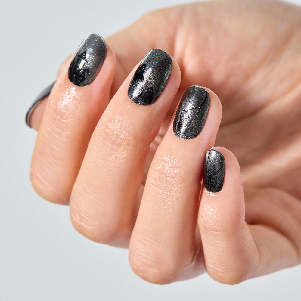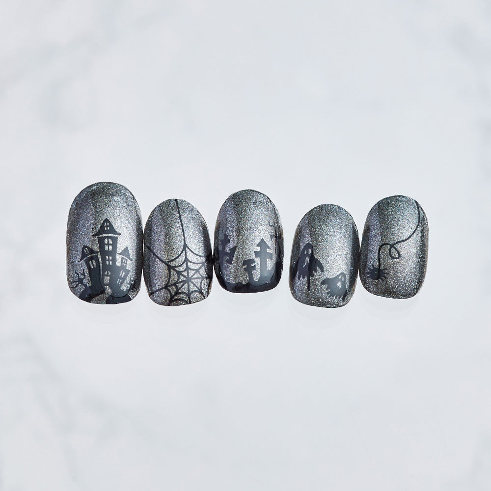 The subtle shimmer of monochrome magnetic glitter evokes moonlight filtering through a dark forest, shifting softly at your fingertips to create a dreamy, ethereal mood. Classic Halloween motifs are drawn in black, adding a sense of tension and mystery within simple forms. The result is a design that feels haunting yet refined—like stepping into a ghost story. With its understated color palette and intricate drawings, this is a versatile Halloween nail anyone can wear with ease. Experience the mysterious allure of a ghostly tale right at your fingertips.