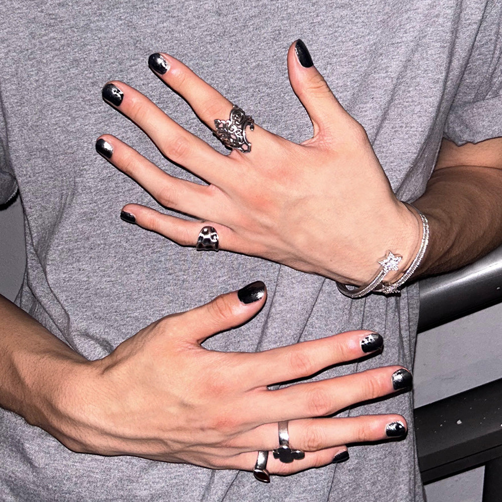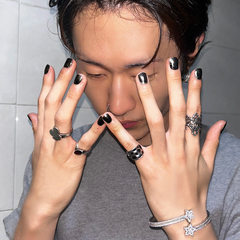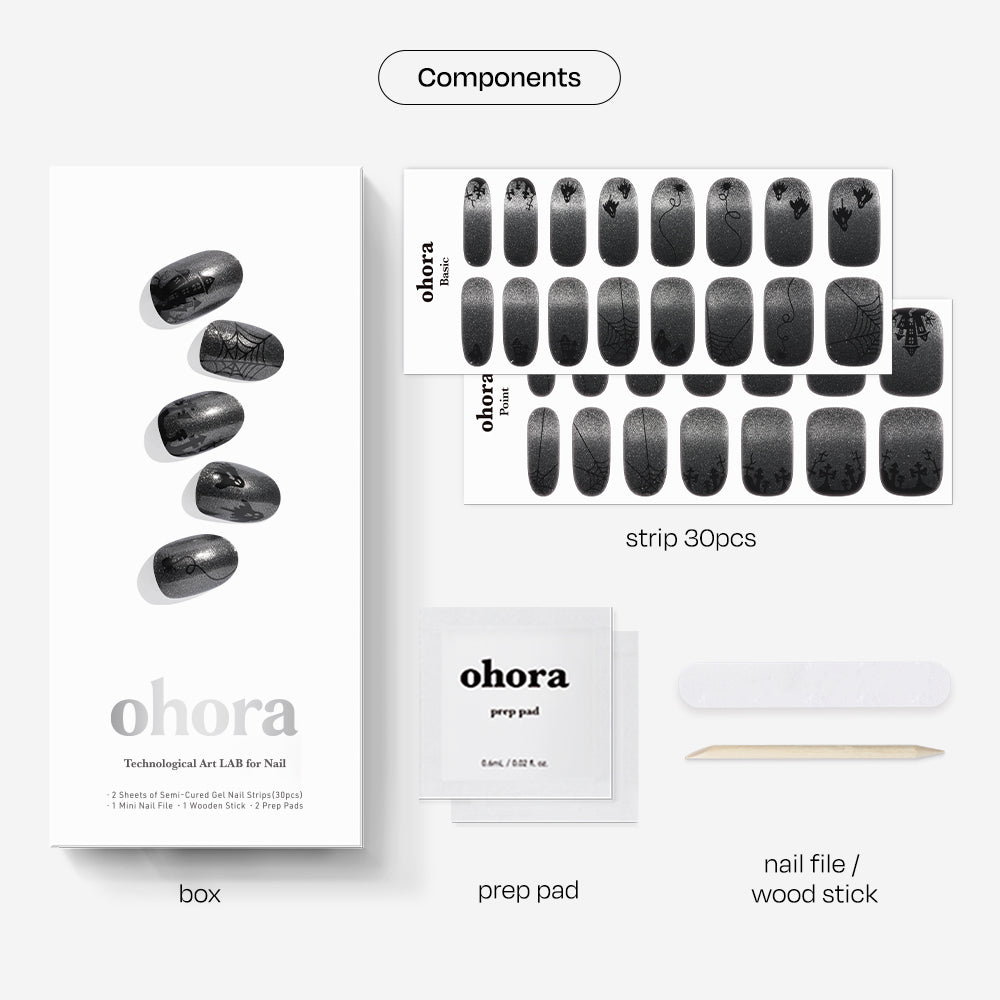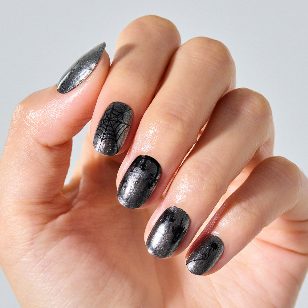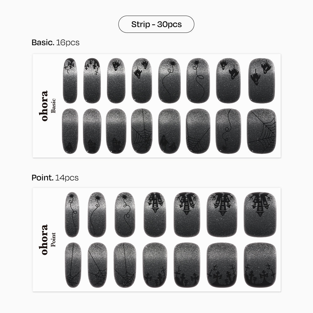 The subtle shimmer of monochrome magnetic glitter evokes moonlight filtering through a dark forest, shifting softly at your fingertips to create a dreamy, ethereal mood. Classic Halloween motifs are drawn in black, adding a sense of tension and mystery within simple forms. The result is a design that feels haunting yet refined—like stepping into a ghost story. With its understated color palette and intricate drawings, this is a versatile Halloween nail anyone can wear with ease. Experience the mysterious allure of a ghostly tale right at your fingertips.