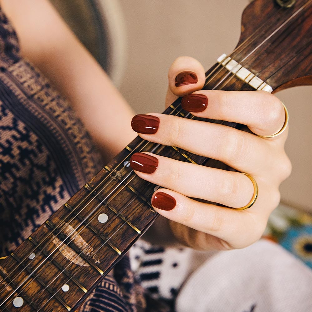 Bold meets warm in this red-brown gel manicure. With a high-gloss finish and long-lasting wear, it's your go-to for an autumn statement.