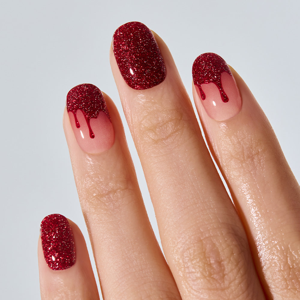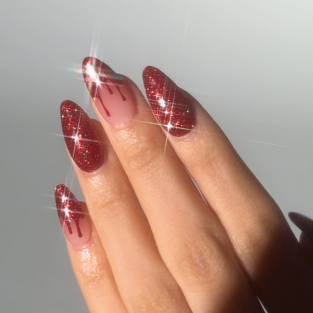 Like blood flowing gently over your fingertips, this hauntingly elegant Halloween design features crimson accents melting into a smoky gradient. The effect is chilling yet mesmerizing—like shards of blood glinting under a cold moonlight. Romantic yet eerie, it’s a bold statement that delivers both sophistication and spine-tingling allure.