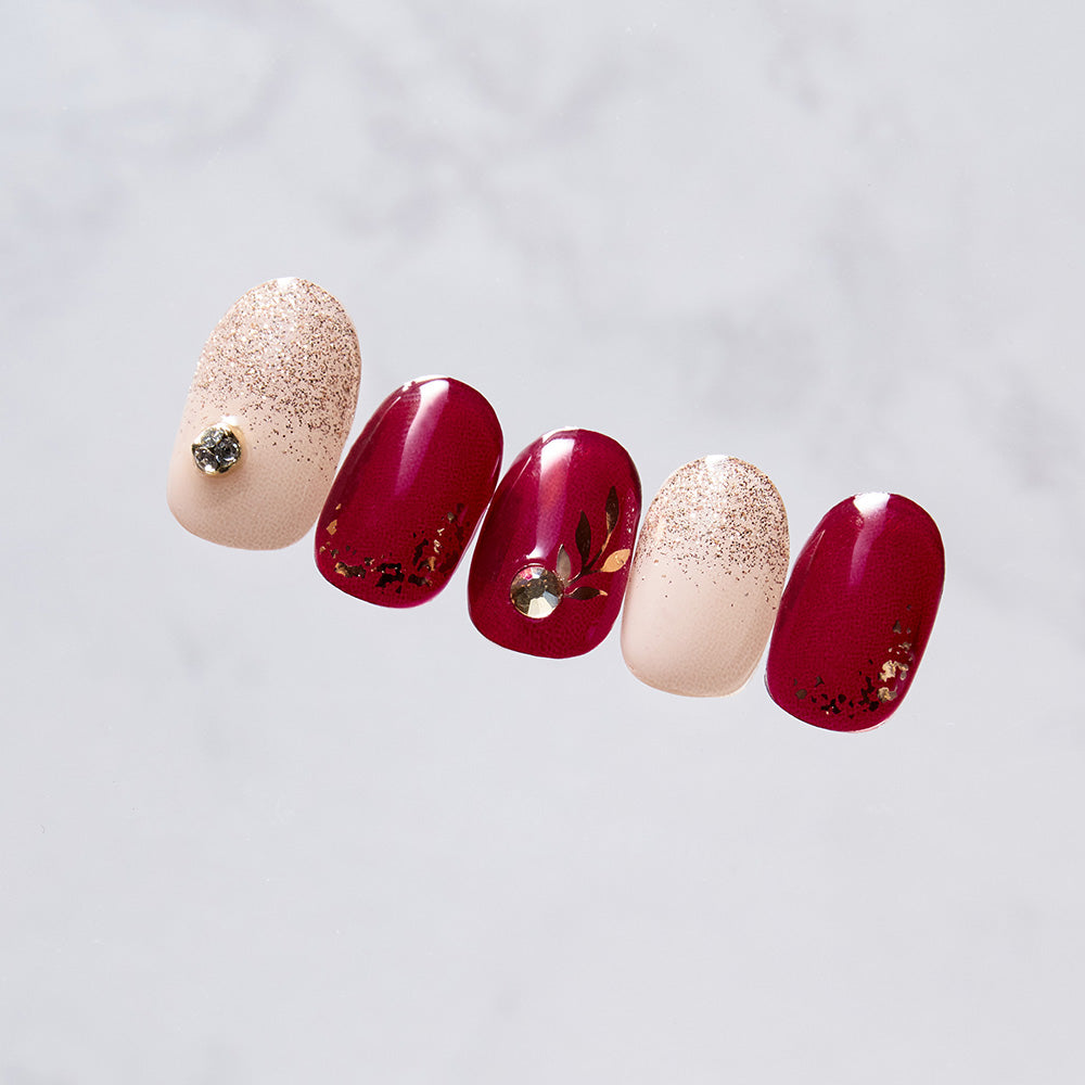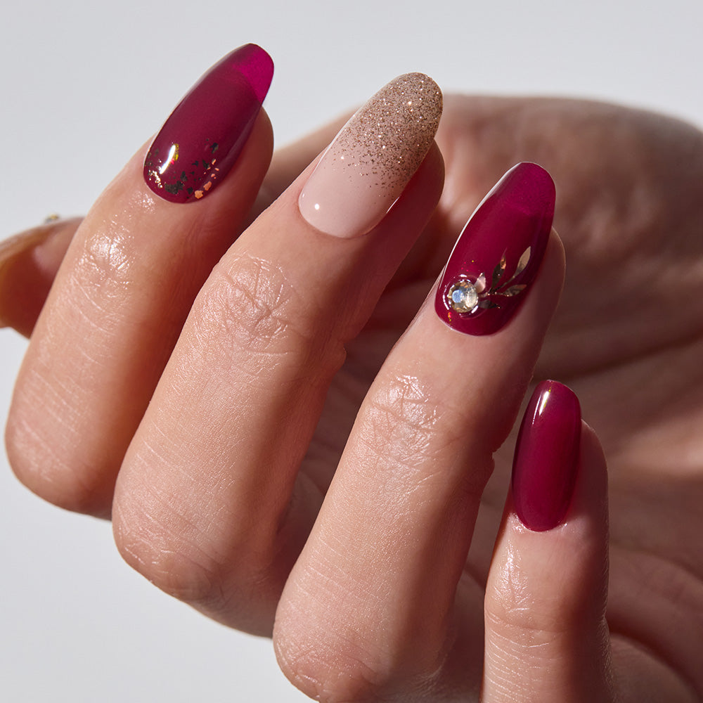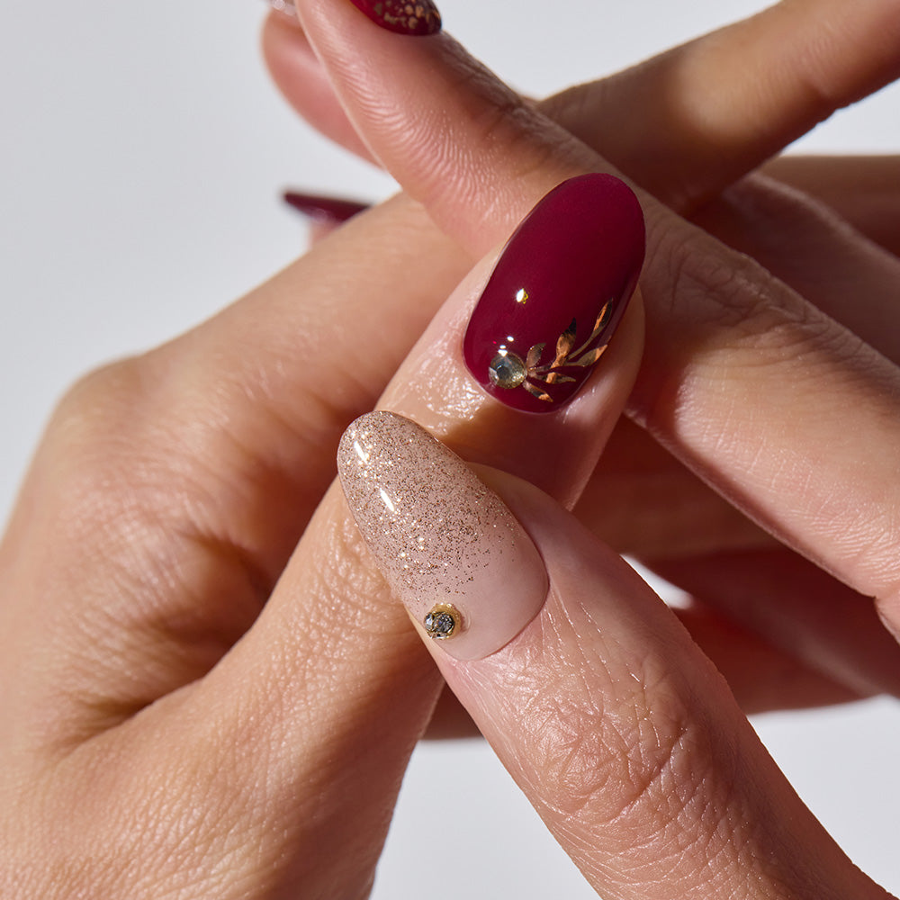 Glitter and gold foil blend naturally, while delicate leaf motifs and crystal accents add a sense of restrained glamour.
